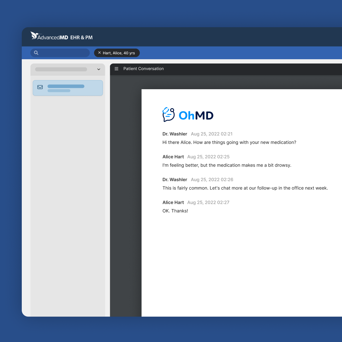 OhMD offers a native AdvancedMD texting integration that allows you to automatically pull your patient details from the EHR then have secure conversations with those patients all through your practice phone number right in OhMD. When the conversation ends, push those chat records back into the AdvancedMD practice management software in a single click!