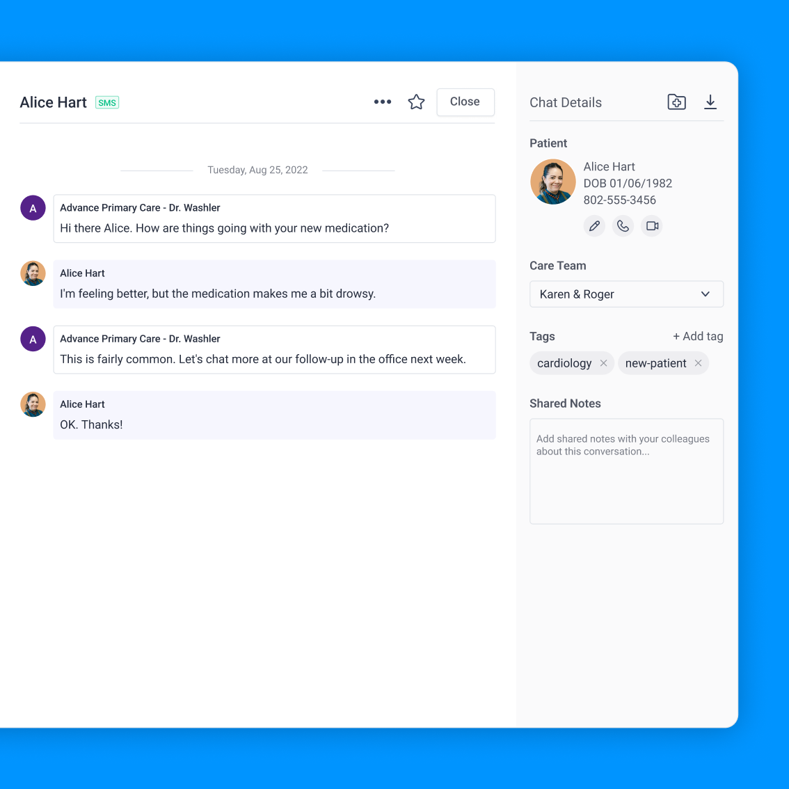 Your entire staff will be able to find, connect, or continue conversations with patients quickly, with details like name, patient ID, MRN, and chart number pulled right in.
