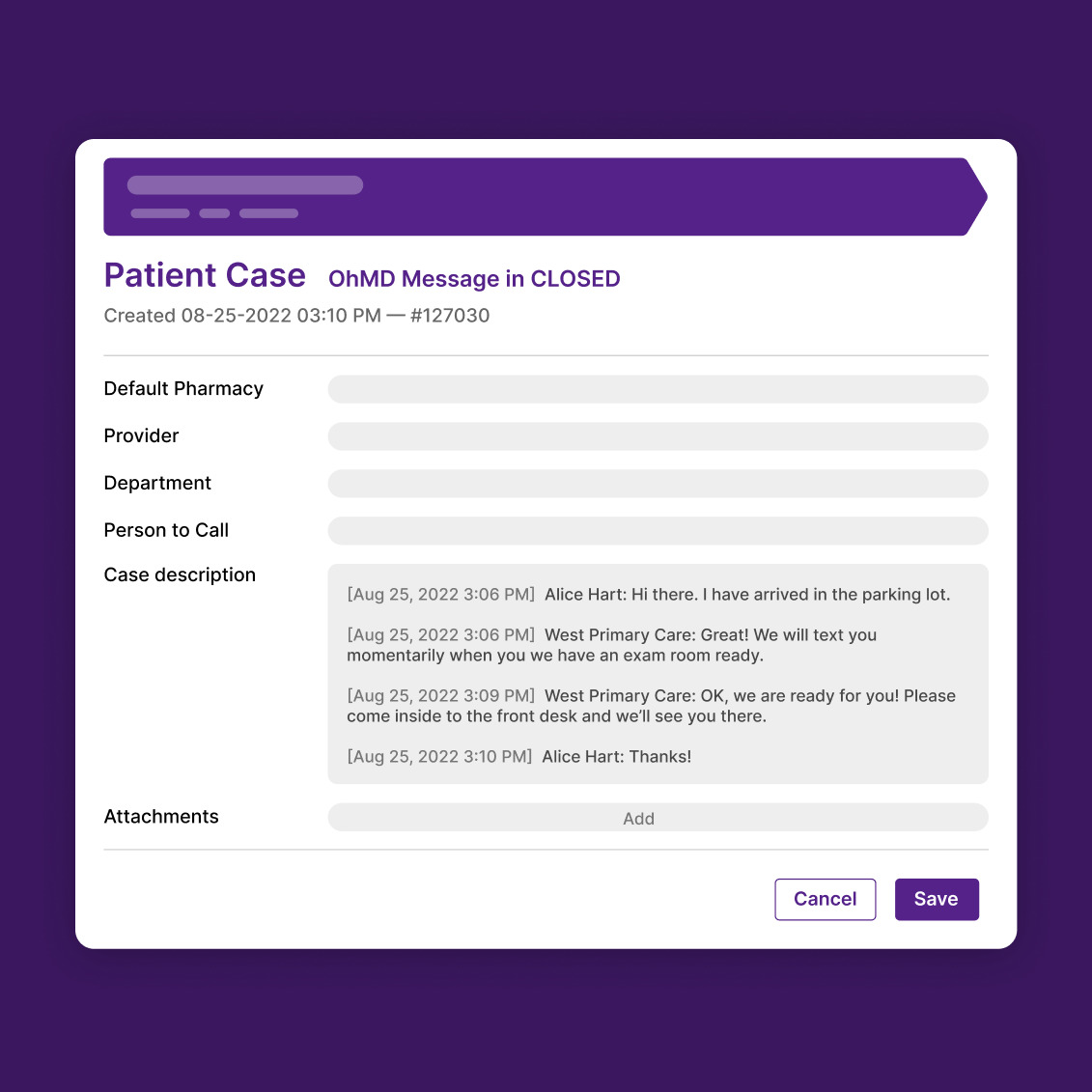 Save your HIPAA compliant patient communications as clinical documents or choose patient cases, allowing you to create additional workflows from the conversations.