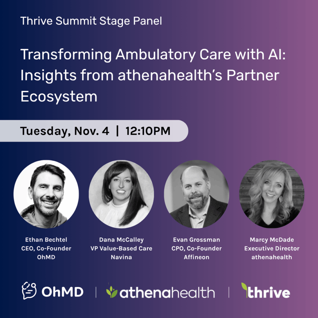 Head over to the Thrive Summit Stage on Tuesday, Nov 4 at 12:10PM for the “Transforming Ambulatory Care with AI: Insights from athenahealth’s Partner Ecosystem” panel. OhMD’s Ethan Bechtel will be joined by Dana McCalley (Navina), Evan Grossman (Affineon), and Marcy McDade (athenahealth).