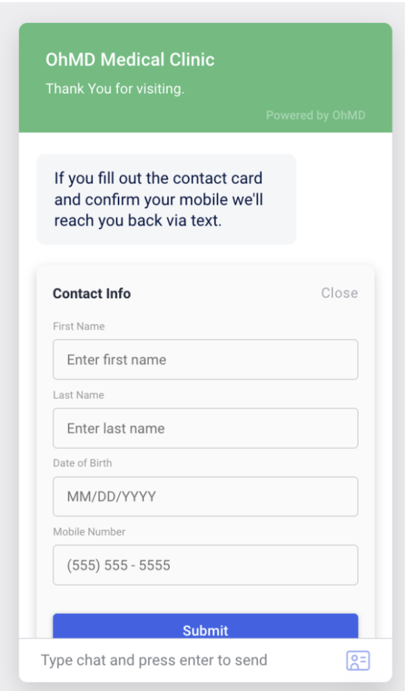 Some HIPAA compliant live chat tools, like OhMD, for example, offer a contact card that helps you stay in touch. You can set up a simple to follow contact form that collects all the necessary information you’ll need to respond effectively.